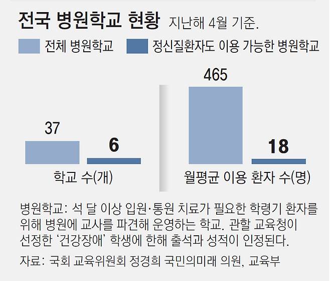 문제는 최 양처럼 우울증이나 주의력결핍과잉행동장애(ADHD), 불안장애 등 정신질환으로 장기 입원하는 학생은 병원학교를 이용하기 어렵다는 점이다. 국회 교육위원회 정경희 국민의미래 의원이 교육부로부터 제출받은 자료에 따르면 전국 병원학교는 37곳인데, 정신질환자가 이용할 수 있는 곳은 그중 6곳뿐이다. 31곳은 신체질환자만 등록이 가능하다.