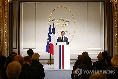 epa11228474 French President Emmanuel Macron delivers his speech during a ceremony celebrating the 80th anniversary of the Council of French Jewish Institutions (CRIF - Conseil Representatif des Institutions juives de France) at the Elysee Palace in Paris, France, 18 March 2024. EPA/YOAN VALAT / POOL
