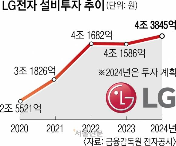 LG전자는 18일 공시한 2023년 사업보고서를 통해 “올해 신모델 개발, 품질 개선, 생산능력 향상 등에 4조 3845억원의 신규 투자를 집행할 계획”이라고 밝혔다. 지난해 시설투자 금액 4조 1586억원보다 5.4% 늘어난 규모다. 생활가전을 담당하는 H&A사업본부와 전장(자동차 전기·전자장치) 사업 담당인 VS사업본부의 올해 예상 투자액이 전체 투자액의 절반을 차지한다.