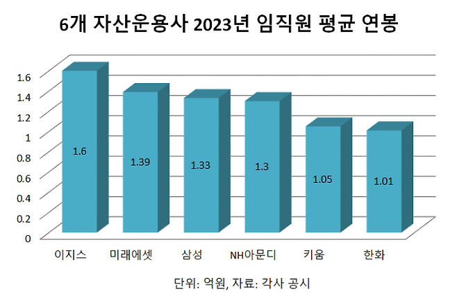 18일 각 운용사들이 공개한 ‘지배구조 및 보수체계 연차 보고서’에 따르면 공시된 6개 주요 자산운용사(미래에셋, 삼성, 이지스, 한화, NH아문디, 키움)의 임직원 평균 연봉은 1억2800만원으로 나타났다. KB자산운용, 한국투자신탁운용, 신한자산운용은 아직 공시하지 않았다.
