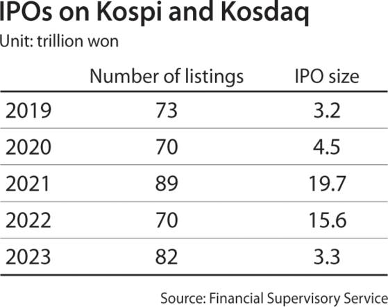 A total of 82 companies went public on the Kospi and Kosdaq markets last year, up from 70 firms a year earlier, according to the Financial Supervisory Service (FSS), but the amount of funds raised decelerated to 3.3 trillion won ($2.5 billion) from 15.6 trillion won over the same period.
