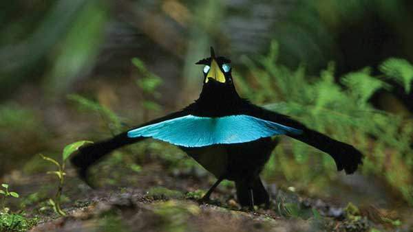 "이 숲속에는 먹이가 풍부해서 극락조 수컷들은 한 가지 일에만 집중할 수 있지요. 바로 암컷을 유혹하는 일입니다."