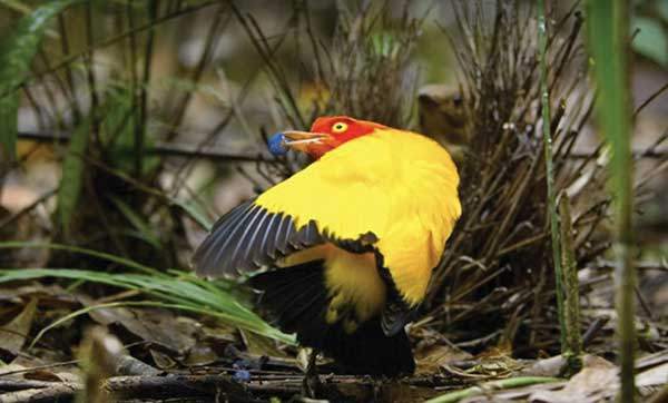 나뭇가지로 마치 아치를 뒤집어 놓은 듯한 U자 모양의 바우어를 만들고, 그 바우어에 자리 잡는 암컷 앞에서 파란 열매를 입에 문 채 엉덩이와 몸통을 시계방향을 천천히 돌리며 춤을 추는 '불꽃바우어새'도 멋지다. 노란색 몸통과 붉은색 머리로 "전 세계에서 가장 밝은 색을 지닌 새"로 불리는 이 새는 암컷의 호감을 사려고 동공을 키웠다 줄이는 '개인기'도 선보인다.