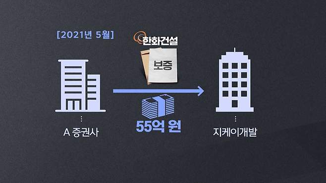 2021년 5월 작성된 대출약정서는 모 증권사가 세운 페이퍼컴퍼니가 지케이개발에 55억 원 대출을 내주는 과정에서 한화건설이 이 돈을 전부 보증 서준다는 내용입니다.