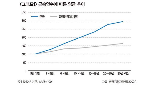 한국 노동시장의 가장 고질적 문제는 '연공서열' 시스템이다. 한국 근로자는 시간이 갈수록 점점 더 높은 연봉을 받는데, 이는 유럽이나 미국 등 다른 선진국에서는 쉽게 찾아볼 수 없는 현상이다(그래프1 참조). 이 시스템은 1960~1970년대 한국 기업들이 가진 돈이 없고, 고등교육을 받은 근로자가 턱없이 부족한 환경에서 탄생했다. 기업은 근로자에게 "연차가 쌓일수록 더 많은 연봉을 주겠다"는 약속을 통해 당장 인건비 부담을 덜고 사내 교육 등으로 생산성이 높아진 근로자들의 이직을 막을 수 있었다.