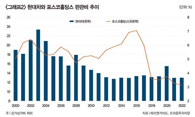 이 결과 한국 주력 수출 산업의 판관비(감가상각비 제외)는 2010년 전후로 꾸준히 떨어지고 있음을 알 수 있다(그래프2 참조). 판관비는 판매비와 관리비를 합친 것으로, 판매비는 제품 판매와 관련해 발생하는 각종 비용을 뜻한다. 관리비는 회사 관리와 유지에 필요한 비용으로 임금이나 임차료, 감가상각비가 포함된다.