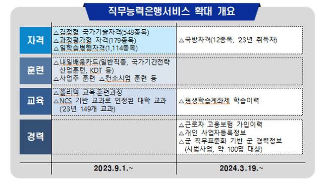 고용노동부와 산업인력공단은 19일 각종 직무능력 정보를 통합 관리하는 '직무능력은행'의 서비스에 고용보험 가입 이력과 평생학습계좌제 학습 이력, 개인 사업자등록 정보, 국방자격(12종목) 및 군 직무경력 정보 등이 추가된다고 밝혔다.