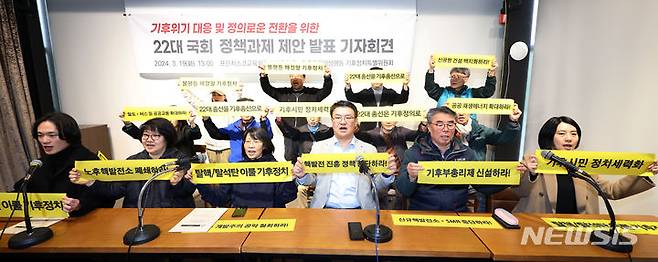 [서울=뉴시스] 홍효식 기자 = 기후위기비상행동 기후정치특별위원회 관계자들이 19일 서울 중구 프란치스코 교육회관에서 열린 기후위기 대응 및 정의로운 전환을 위한 22대 국회 정책과제 제안 발표 기자회견에서 피켓을 들고 구호를 외치고 있다. 2024.03.19. yesphoto@newsis.com