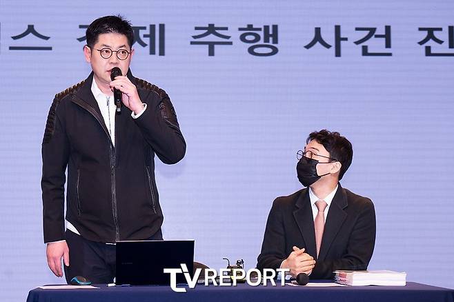 [TV리포트=오민아 기자] 스파이어엔터테인먼트 황성우 대표와 김태우 변호사가 19일 오후 서울 강남구 성암아트홀에서 열린 '오메가엑스 강제추행 사건 CCTV 영상 공개 및 고소장 접수 발표 기자회견'에 참석해 의견을 말하고 있다.
