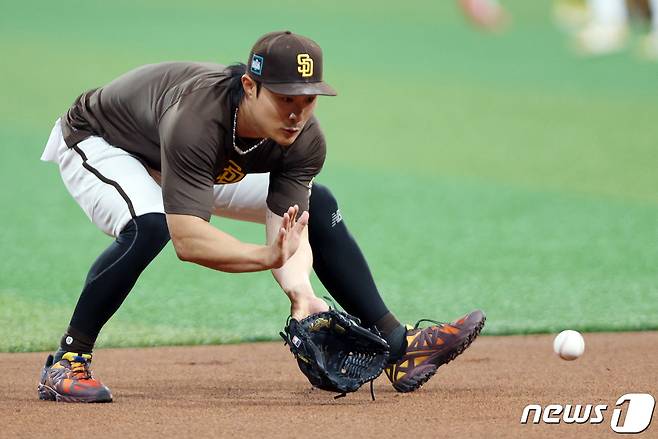 (서울=뉴스1) 박정호 기자 = 샌디에이고 파드리스 김하성이 미국프로야구(MLB) 공식 개막시리즈를 하루 앞둔 19일 오전 서울 고척스카이돔에서 훈련을 하고 있다. 2024.3.19/뉴스1