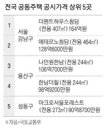 용산구 한남동 나인원한남(전용면적 244㎡)은 지난해 2위에서 한 단계 아래인 3위로 내려왔다. 공시가격은 106억7000만원으로 산정됐다. 한남더힐(전용 244㎡·98억9200만원)도 지난해 3위에서 한 계단 내려 4위가 됐다. 서울 성동구 성수동1가 아크로서울포레스트(전용 273㎡)는 90억8700만원으로 5위를 유지했다.