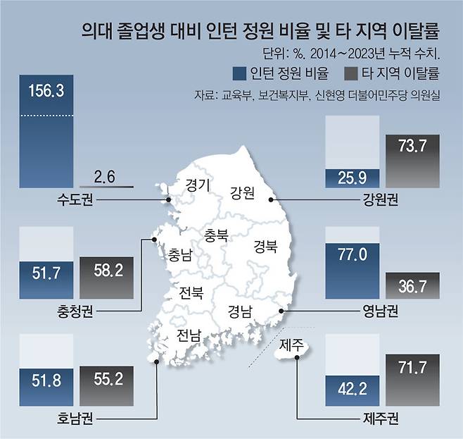 국회 보건복지위원회 소속 신현영 더불어민주당 의원이 보건복지부에서 받은 자료에 따르면 2014∼2023년 지방 의대 졸업생 1만9408명 중 9067명(46.7%)이 수도권 의대 병원에서 인턴 수련을 받았다. 특히 경북 소재 의대 졸업생의 경우 무려 90%가 수도권에서 수련을 받았다. 반면 수도권 의대를 졸업한 의대생의 경우 97.4%가 수도권에 남아 대조를 보였다.