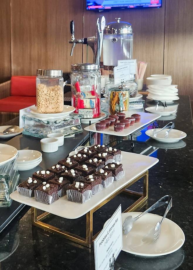 꽤 넓고 쾌적한 공간과 적당한 음식, 활주로 뷰가 갖춰진 공간이다. 음식은 전채, 메인, 후식, 주류가 종류별로 알차게 구성돼 있다.