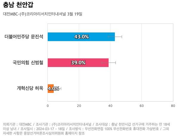 4.10 총선 충남 천안갑 지역구 여론조사 결과 더불어민주당 문진석 후보 43%, 국민의힘 신범철 후보 39%, 개혁신당 허욱 후보 4%로 집계됐다.