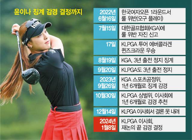 루키 시즌이던 2022년 6월 한국여자오픈에서 자기 볼이 아닌 볼을 치는 오구(誤球) 플레이를 범한 윤이나는 한 달이나 지난 뒤에야 룰 위반을 신고해 3년 출전 정지 징계를 받았다. 이후 KLPGA는 올해 1월 이사회에서 윤이나의 징계 기간을 1년 6개월로 줄여줬다. 이로써 4월 열릴 2024 KLPGA 투어 국내 개막전부터 윤이나는 정상 참가가 가능해졌다.