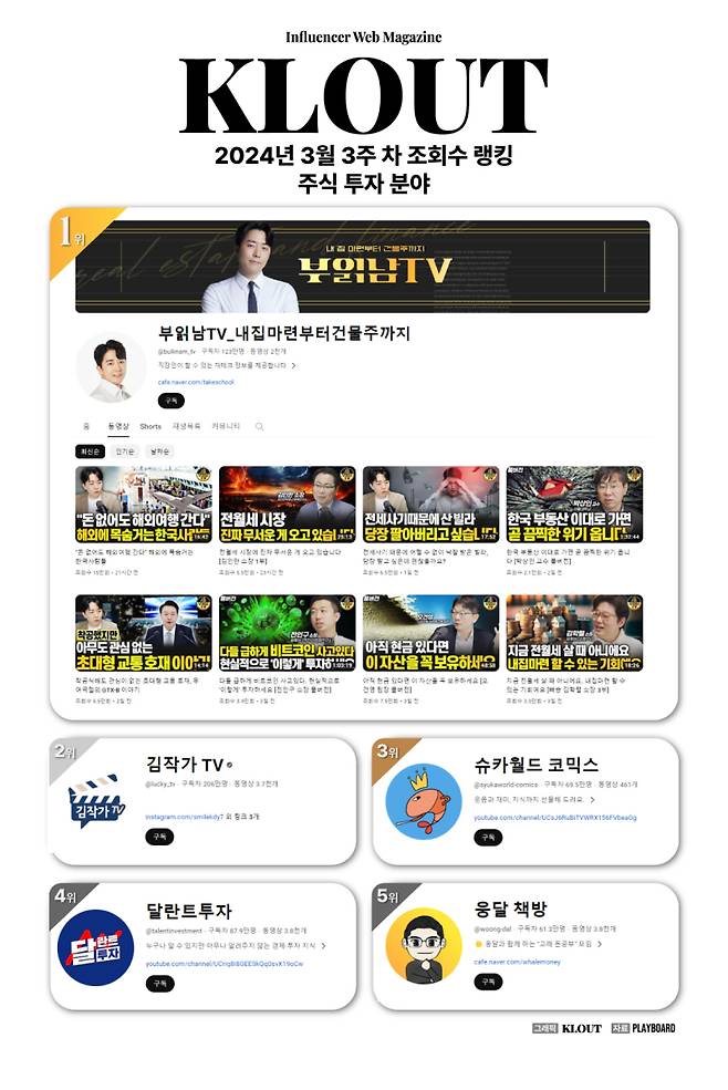 [KLOUT 노은진 에디터] 부동산 전문 유튜버 '부읽남TV_내집마련부터건물주까지'(이하 부읽남TV)가 3월 3주 차 유튜브 주식 투자 분야 조회수 랭킹 1위를 차지했다.