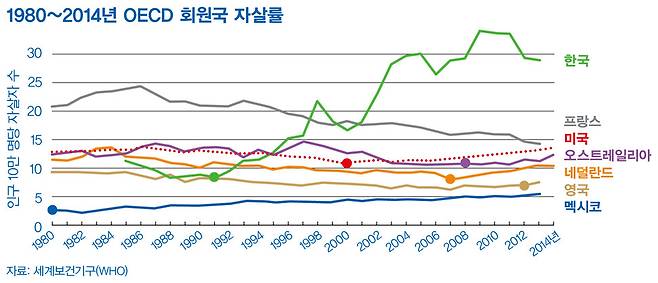 둘째는 자살률이 급격히 높아진 시기가 있다는 것이다. 한국의 자살률은 1997~1998년, 2001~2003년, 2008~2009년에 각각 크게 늘어났다. 외환위기, 카드 대란, 글로벌 금융위기가 발생한 시기다. 이는 한국의 자살이 개인적·문화적 요인이 아니라 사회적·경제적 요인으로 일어난다는 것을 의미한다. 한국 사람들이 다른 나라 사람들보다 많이 자살하는 것은 개인들의 책임이 아니라 사회시스템의 문제다.
