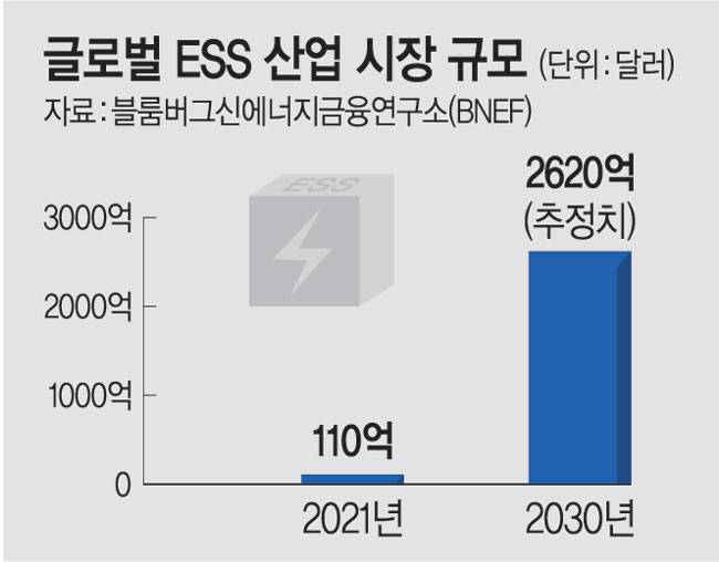 반면 ESS 시장은 각국의 친환경 에너지정책 기조 강화 흐름을 타고 높은 성장세를 보이고 있다. 실제 블룸버그신에너지금융연구소(BNEF)는 글로벌 ESS 산업 시장이 지난 2021년 110억 달러(약 15조 원)에서 오는 2030년 2620억 달러(351조 원)로 약 24배 성장할 것으로 예상했다.