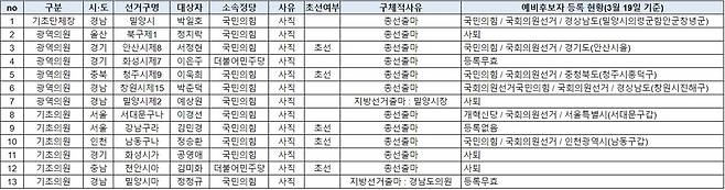 | ▲ 위 정보 중 '구체적 사유'는 언론 검색을 통해 취합함. 나머지 정보는 중앙선거관리위원회의 2024.4.10 실시 재·보궐 선거 확정상황 및 예비후보자 검색을 취합한 정보임. |