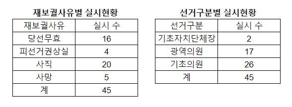 피선거권이 상실된 선출직 공직자는 총 4명이다. 대구지역의 기초의원의 경우(대구 중구의원, 대구 수성구의원) 주소지를 이전하여 피선거권을 상실하게 되었다. 지방자치법에 따르면 지방의원이 해당 지방자치단체 구역 밖으로 주민등록을 이전할 경우 피선거권이 없어지게 되는데, 주민 대표성을 위해 관내 거주를 원칙으로 삼고 있는 지방의원의 가장 기본적인 사항도 지켜지지 않는 실정이다. 또한 경북 의성군의회 김동준 전 의원(의성군다선거구)의 경우 차명으로 관내 공사를 우회적으로 수주한 혐의로 기소되었는데, 징역형 집행유예 선고로 피선거권이 상실되었다. 지방의원의 본분을 망각하고 사적 이익을 위해 공권력을 남용하여 유권자를 기만하는 태도를 보였다.