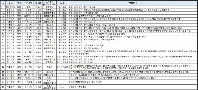 이처럼 범법 행위로 당선무효나 피선거권이 박탈되거나 사퇴한 이들은 기초의원이 15명, 광역의원 9명, 기초단체장 1명으로 기초의회 수준에서 문제가 더욱 심각한 것으로 나타났다. 당선시점의 정당은 국민의 힘이 13명, 더불어민주당 10명으로 정당별로 큰 차이는 없지만, 당선 이전부터 이미 당선무효 전력이 있거나 전과기록이 있었던 경우도 있어 각 정당의 공천 검증 과정에서의 허점도 확인할 수 있다.