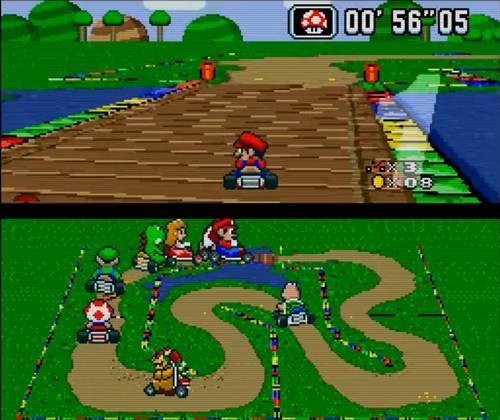 매 시리즈마다 다양한 재미를 주는 기믹 요소와 코스들을 제공해주고 있지만 최초의 버전은 오로지 2인용만 가능한 게임으로 3D 기술도 없던 시절에 2D 그래픽을 활용해서 3D 같은 효과를 빠르게 적용하기 위하여 DSP1 특수칩을 사용했죠. 이 칩셋을 적용한 게임 중에는 '파일럿 윙스'와 '슈퍼 에어 다이버 2' 등이 존재합니다.