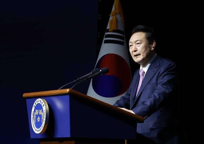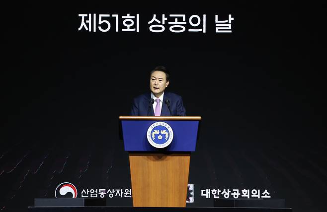 [윤석열 대통령이 20일 서울 영등포구 63컨벤션센터에서 열린 제51회 상공의 날 기념식에서 '자유주의 경제시스템에서 기업활동의 자유와 국가의 역할'을 주제로 특별 강연을 하고 있다. (사진=연합뉴스)]
