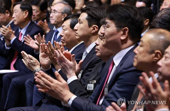 (서울=연합뉴스) 홍해인 기자 = 20일 서울 영등포구 63컨벤션센터에서 열린 제51회 상공의 날 기념식에서 기업 대표자들이 윤석열 대통령의 '자유주의 경제시스템에서 기업활동의 자유와 국가의 역할'을 주제로 한 특별 강연 중 박수를 치고 있다.