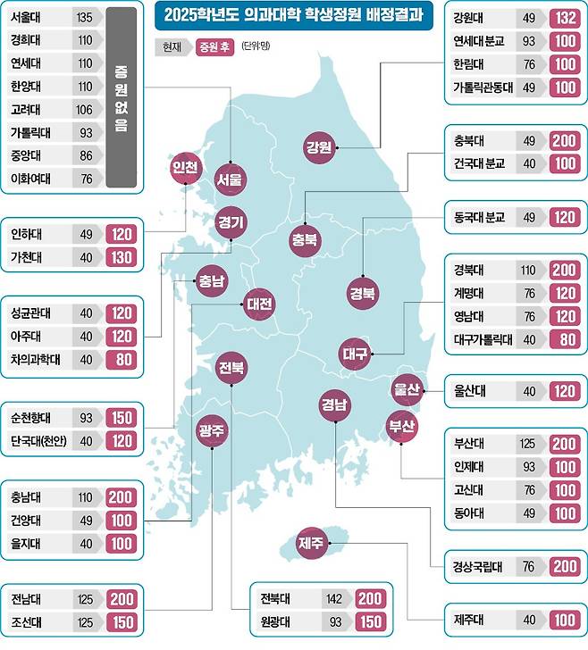 지방에 있는 미니 의대들의 정원도 많이 늘어났다. 40~49명이던 입학정원이 2025학년도부터 각각 80~120명으로 확대됐다.
