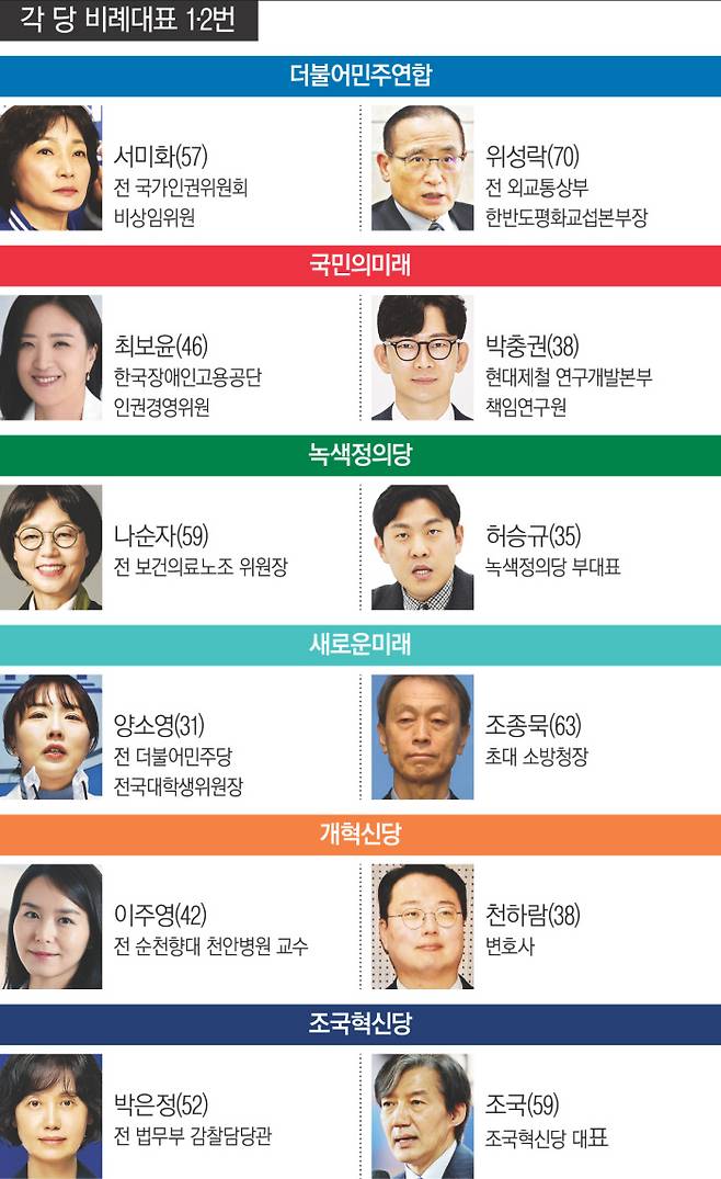 소수정당들은 정체성을 드러낼 인물을 집중 배치했다. 윤석열 정권 조기 종식을 내건 조국혁신당은 문재인 정부 때 윤석열 검찰총장을 감찰했다가 해임된 박은정 전 법무부 감찰담당관이 비례 1번, 법무부 장관 시절 ‘윤석열 검찰’의 수사를 받은 조국 당대표가 비례 2번이다.