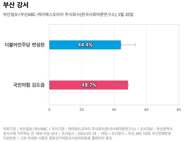 4.10 총선 부산 강서 지역구 여론조사 결과 국민의힘 김도읍 후보 48.7%, 더불어민주당 변성완 후보 44.4%로 집계됐다.