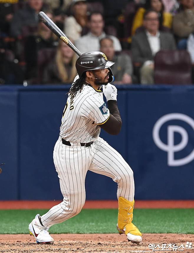 (엑스포츠뉴스 고척, 박지영 기자) 20일 오후 서울 구로구 고척스카이돔에서 열리는 '메이저리그(MLB) 월드투어 서울시리즈 2024' LA 다저스와 샌디에이고 파드리스의 개막전 경기, 4회말 무사 만루 샌디에이고 캄푸사노가 1타점 병살타를 때려내고 있다.