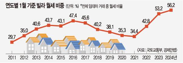 부동산 정보 제공업체 경제만랩은 20일 국토교통부 실거래 데이터를 살펴본 결과 올해 1월 전국 빌라 임대차 거래 2만 1146건 중 56.2%인 1만1878건이 월세였다고 밝혔다. 이 비중은 1월 기준으로 국토교통부가 관련 통계 작성을 시작한 2011년 이후 가장 높다. 2011년 29.7%였던 빌라 월세 비중은 2012년 35.0%, 2013년 40.6%로 올라선 데 이어 2016년 47.4%까지 늘었다가 이듬해부터 하락했다. 2021년 34.4%까지 낮아졌던 비중은 2022년부터 올해까지 3년 연속 상승했다. 황한솔 경제만랩 리서치연구원은 “전세보증금 미반환 사고 등에 따른 전세 기피 현상으로 빌라 임대차 시장에서 월세 선호가 강해지고 있다”고 평가했다.