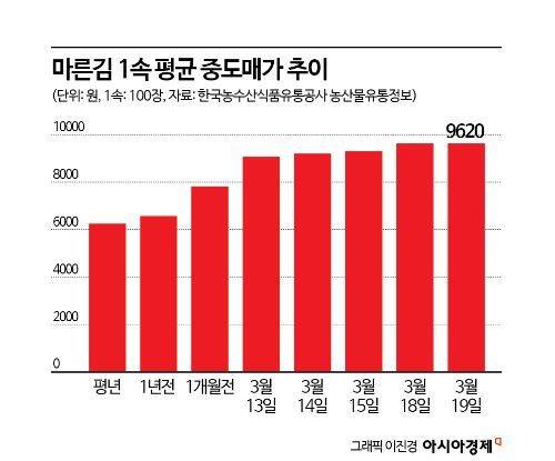 생산량 감소로 값이 오른 원초로 제품을 생산하게 되는 다음 달부터는 김 가격 인상폭이 더 커질 수 있다는 전망이 나온다. 김은 일반적으로 12월부터 이듬해 4월까지 수확하는데 식품기업은 이 시기 1년치 원초를 한 번에 수매해 제품으로 만든다. 한국해양수산개발원에 따르면 예년보다 빠른 수온 상승이 예상돼 4월에도 생산량이 많지 않을 것으로 전망된다. 4월 김 생산량은 전년 동기 대비 38% 정도 적은 820만속으로 예상되고, 생산량 감소로 도매가 역시 이달은 물론 작년보다 높을 것으로 보인다.