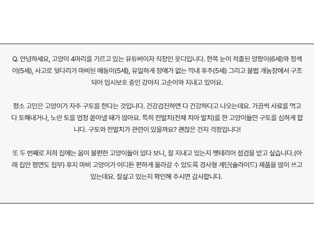 A. 안녕하세요. [24시 센트럴 동물메디컬센터] 원장이자 [24시간 고양이 육아대백과]의 저자인 김효진 수의사입니다. 이번에는 고양이 4마리, 강아지 1마리와 함께하시는 11만 유튜브 읏디님이 사연을 보내주셨어요. 저도 평소 읏디님의 유튜브를 즐겨 보곤 했었는데요. 읏디님께서 두 가지 질문을 해주셨습니다. 하나는 전발치한 고양이가 자꾸만 구토를 해서 괜찮을지 문의해 주셨고, 다른 하나는 집 안의 환경이 고양이에게 적절한지 펫테리어를 문의해 주셨네요. 그럼 읏디님의 궁금증을 하나씩 풀어볼까요?