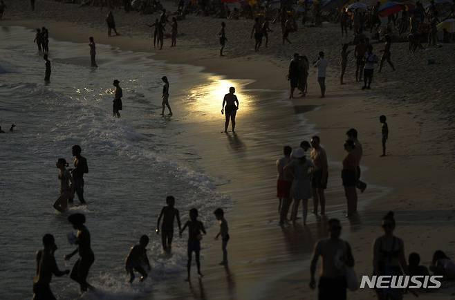 [리우데자네이루=AP/뉴시스] 20일(현지시각) 브라질 리우데자네이루의 아르포아도루 해변에서 사람들이 물놀이를 하며 무더위를 견뎌내고 있다. 2024.03.21.