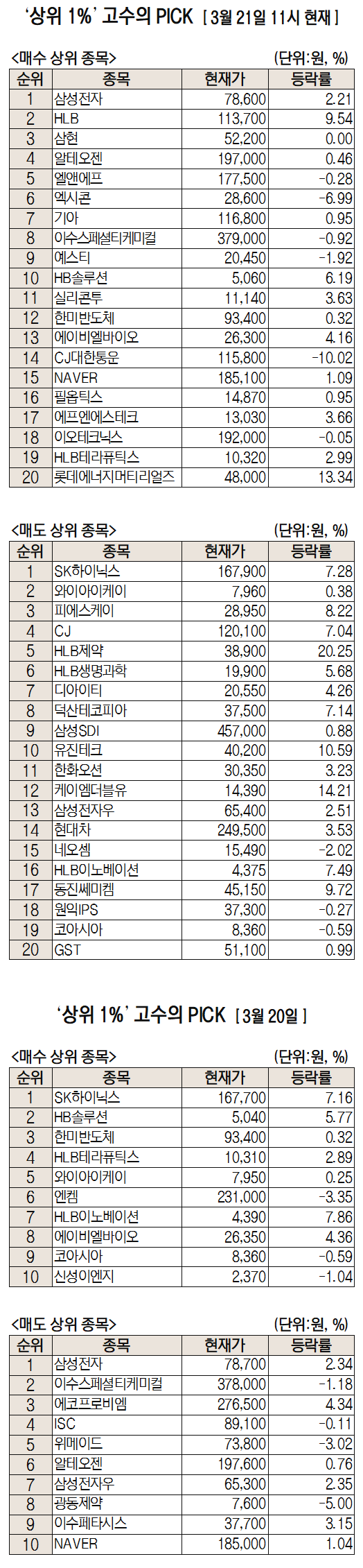 미래에셋증권은 자사 고객 중에서 지난 1개월간 수익률 상위 1% 투자자들의 매매 종목을 집계해 실시간·전일·최근 5일 기준으로 모바일트레이딩시스템(MTS)상에서 공개하고 있다. 이 통계 데이터는 미래에셋증권의 의견과 무관한 단순 정보 안내이며 각각의 투자자 개인에게 맞는 투자 또는 수익 달성을 보장하지 않는다. 또 테마주 관련종목은 이상 급등락 가능성이 있으므로 유의해야 한다.
