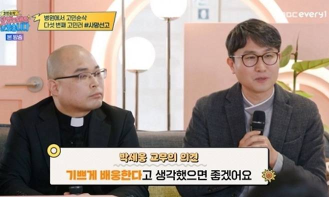 다음으로 4인의 성직자와 MC들은 병원에서 두 번째 고민 상담소를 오픈했다. 이곳에서도 직업과 상관없이 모두가 공감할 만한 고민들이 이어졌다. 먼저 MZ세대와 소통을 고민하는 간호 수녀님에게는 하성용 신부가 "MZ세대를 아직 한국이 낯선 외국인이라고 생각하고, 때로는 이해가 안 돼도 충분히 기다려 주신다면 후배들도 감사할 것"이라고 말했다.