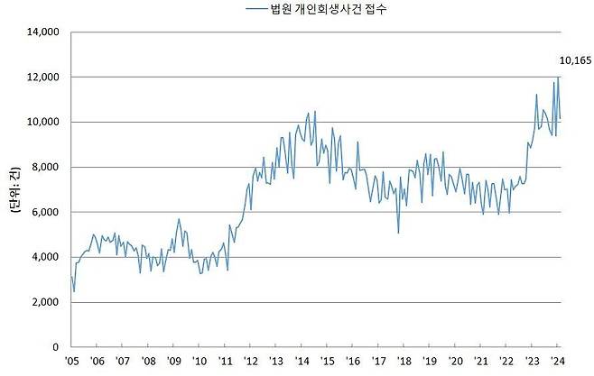 세월호 참사 충격으로 내수 둔화가 극심했던 2014년 7월 1만489건으로 역대 최대를 기록했던 월별 개인회생 신청 건수는 이후 꾸준히 1만건 이하 수준을 유지하다가 금리상승기를 거쳐 지난해 3월 9년 만에 1만1228건을 기록했고, 지난 1월 1만2002건으로 다시 치솟았다.