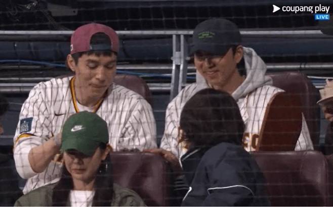 관중석에는 초록색 모자와 점퍼를 입은 손예진과 장발의 현빈 부부가 다정한 포즈로 야구장 데이트에 나섰고, 그 뒷자리에는 공유 이동욱이 샌디에이고 유니폼을 입고 착석해 브로맨스를 뽐냈다.