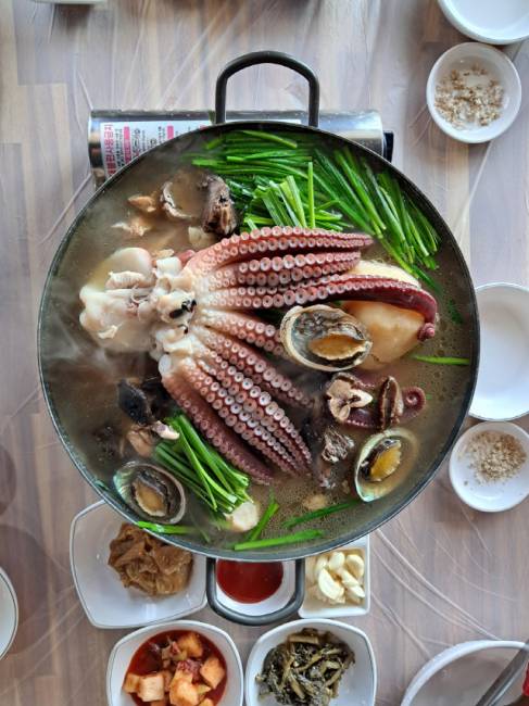 문어국밥, 문어토종닭백숙(사진), 문어숙회무침, 문어물회국수, 문어숙회 등 문어를 이용한 요리는 애주가들에게 빠질 수 없는 식사 겸 안주다.