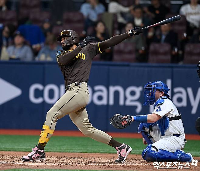 (엑스포츠뉴스 고척, 박지영 기자) 21일 오후 서울 구로구 고척스카이돔에서 열린 '메이저리그(MLB) 월드투어 서울시리즈 2024' LA 다저스와 샌디에이고 파드리스의 경기, 2회초 1사 샌디에이고 타티스 주니어가 좌전 안타를 치고 있다.