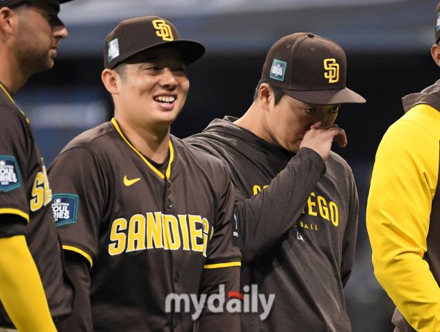 [마이데일리 = 유진형 기자] 21일 서울 고척스카이돔에서 ‘메이저리그 월드투어 서울시리즈 2024’ 샌디에이고 파드리스와 LA 다저스의 경기가 열렸다. 경기 시작 전 샌디에이고 마쓰이 유키와 고우석이 그라운드에 도열해 있다 .