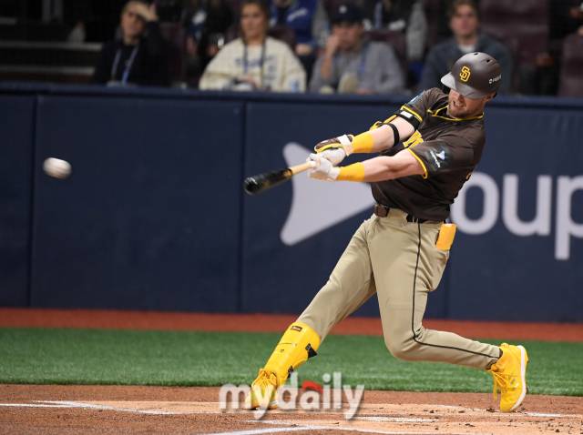 [마이데일리 = 유진형 기자] 21일 서울 고척스카이돔에서 ‘메이저리그 월드투어 서울시리즈 2024’ 샌디에이고 파드리스와 LA 다저스의 경기가 열렸다. 1회초 무사 1,2루에서 샌디에이고 크로넨워스가 2타점 3루타를 때리고 있다.