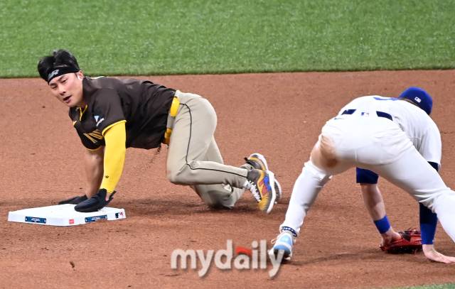 [마이데일리 = 유진형 기자] 21일 서울 고척스카이돔에서 ‘메이저리그 월드투어 서울시리즈 2024’ 샌디에이고 파드리스와 LA 다저스의 경기가 열렸다. 4회초 1사 1루 샌디에이고 김하성이 2루 도루에 성공하고 있다.