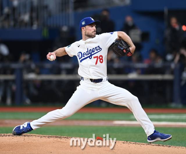 [마이데일리 = 유진형 기자] 21일 서울 고척스카이돔에서 ‘메이저리그 월드투어 서울시리즈 2024’ SD 파드리스와 LA 다저스 열렸다. 선발투수로 등판한 LA 다저스 그로브가 역투하고 있다.