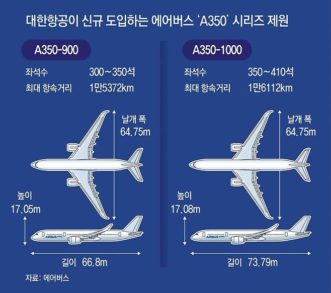 대한항공은 운영 중인 장거리용 ‘A380’과 ‘B747’ ‘A330’ 등은 차차 정리할 계획이다. A380과 B747은 엔진이 4개여서 유지 비용이 많이 들고 A330은 노후화됐기 때문이다. 계획대로라면 대한항공의 장거리용 항공기는 A350과 ‘B787’ ‘B777’로 단순화된다.