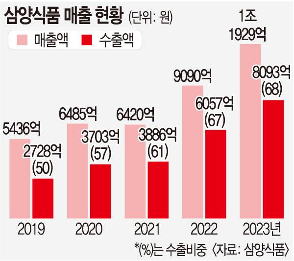 삼양식품 총매출액 1조1929억원 가운데 해외 매출이 차지한 비중은 68%에 이르렀다.