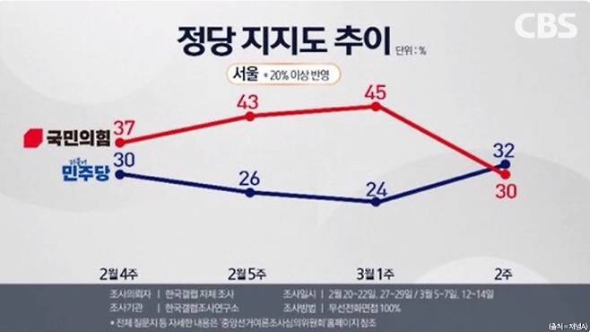 서울의 정당 지지율입니다. 한국 갤럽이 2월 넷째 주부터 3월 둘째 주까지 한 달간 매주 화, 수, 목 이렇게 조사를 한 거예요. 가장 마지막 조사가 지난주 화, 수, 목이니까 3월 12일부터 14일까지 조사를 한 겁니다. 무선 전화면접으로 했습니다. 유튜브와 레인보우로 보실 수 있는 분들은 이 그래프를 좀 보시면서 따라오시죠. 정당 지지율 추이. 국민의힘이 37, 43, 45, 30 민주당이 30, 26, 24, 32. 국민의힘이 쭉 올라가다가 쭉 꺾였어요. 민주당이 쭉 내려가다가 치고 올라왔어요. 이렇게 크로스가 됐군요. 센터장님.