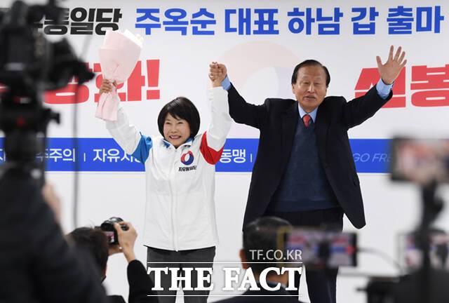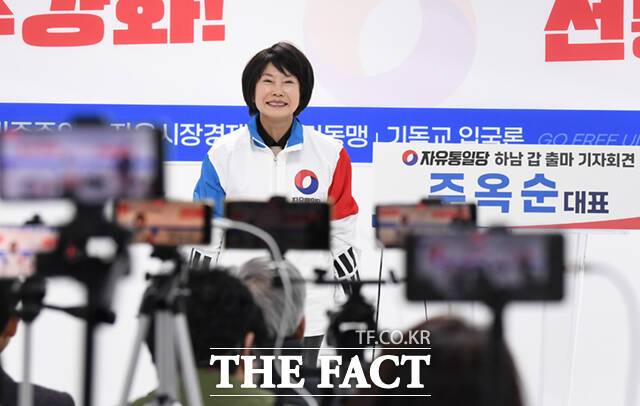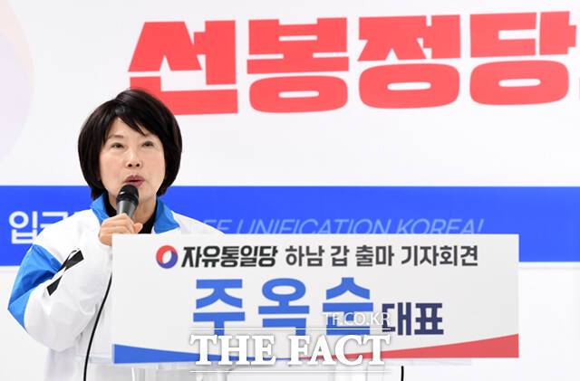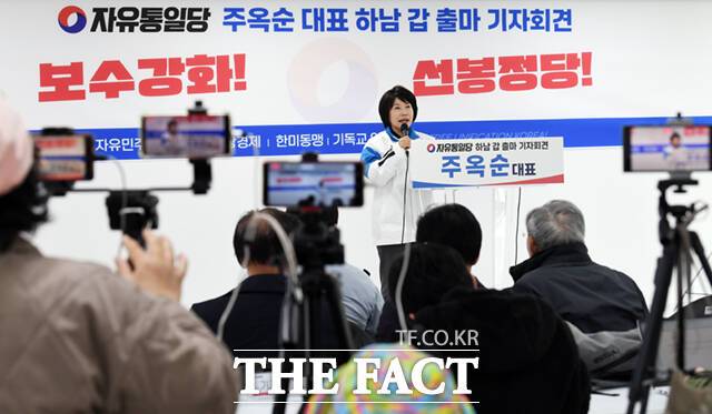 [더팩트ㅣ이새롬 기자] 주옥순 엄마부대 대표가 22일 오전 서울 여의도 자유통일당 중앙당사에서 기자회견을 열고 경기 하남갑 국회의원 출마를 선언하고 있다.